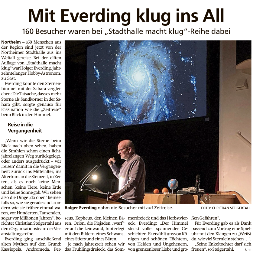 09.03.2025In die riesige Stadthalle waren ca. 150 interessierte und fachkundige Menschen gekommen. So setzte meinerseits etwas Aufregung ein, vielleicht hat es ja niemand bemerkt? Der Vortrag „Faszination Universum“ wurde als „interessant“ und „gut“ zurückgespiegelt, aber auch als streckenweise zu lang.