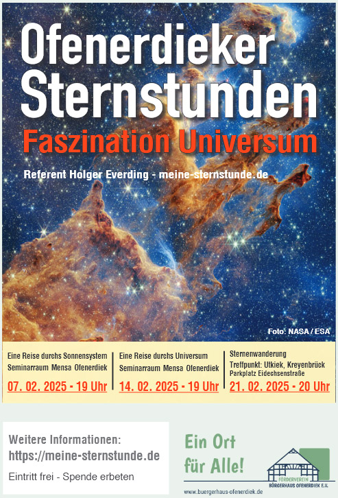 24.04.2025In Zusammenarbeit mit dem Förderverein Bürgerhaus Ofenerdiek e.V. fanden Freitagabends die Vorträge „Reise durchs Sonnensystem“ und „Reise durchs Universum“ in der Mensa des Schulzentrums der Grundschule Ofenerdiek statt. Es kamen ca. 40 Personen.